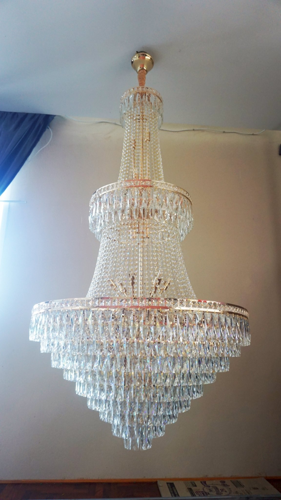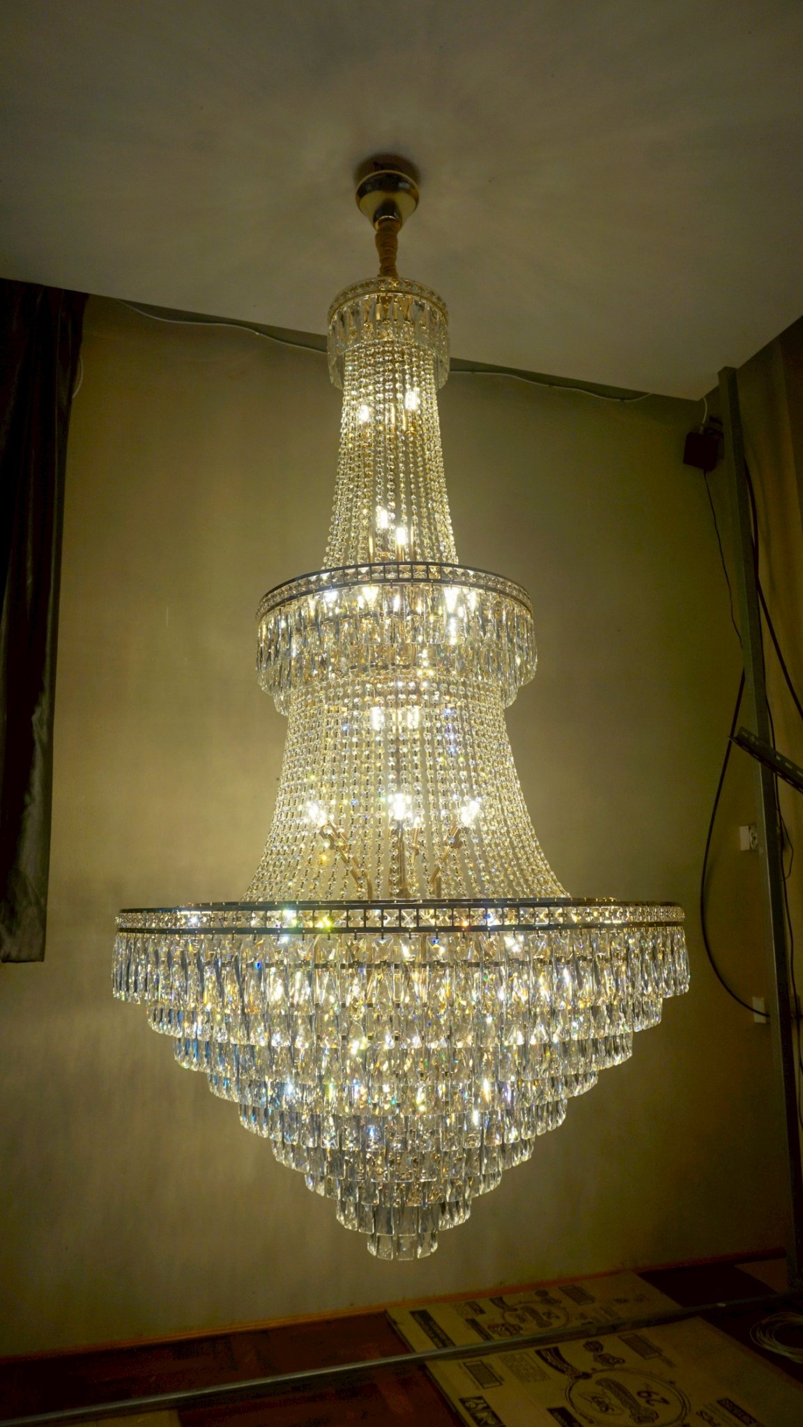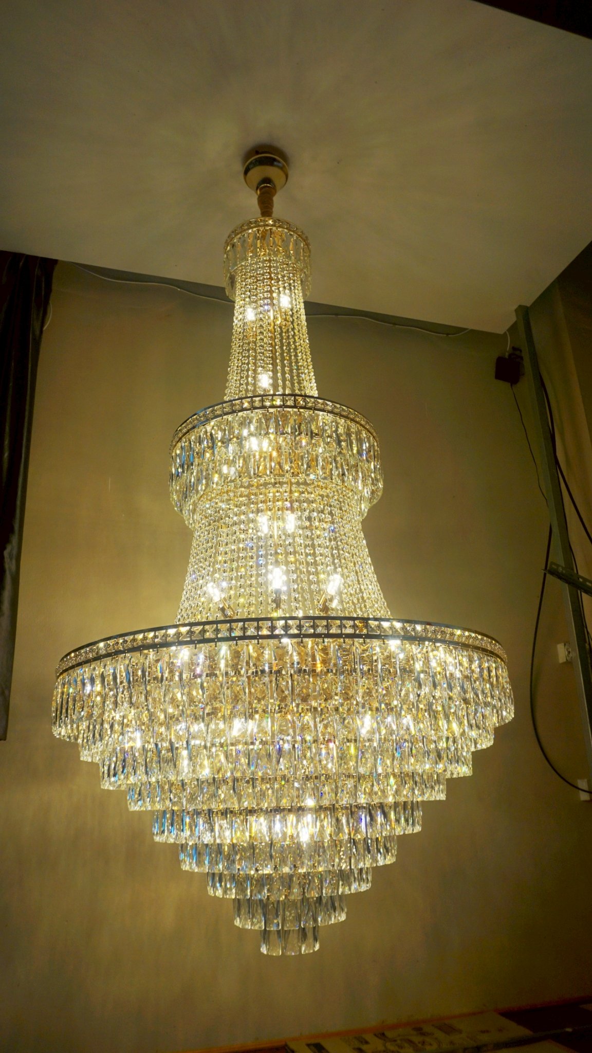 *โคมไฟระย้าคริสตัล สีทอง *ขนาดโคมไฟ กว้าง 100ซม. สูง 180ซม. น้ำหนักโคม 43 KG. *ชุดโซ่ยาว 100 ซม. *ขั้วไฟ E14*38 *ขนากบรรจุภัณฑ์ กล่องโคม (1/2) ก*ล*ส 101*101*25 CM นน.28 KG. กล่องเม็ด (2/2) ก*ล*ส 40*36*22 CM นน. 16 KG. *วัสดุ โครงเหล็กชุบสีทอง/เม็ดคริสตัล เหมาะสำหรับติดตั้งบน ห้องรับแขก ห้องโถง ที่ต้องการความ หรูหรา มีเอกลักษณ์ เหมาะกับโถงบันได ติดผ้าม่าน สีครีม สีแดง เข้ากันได้ดี กับโครงสีทอง
