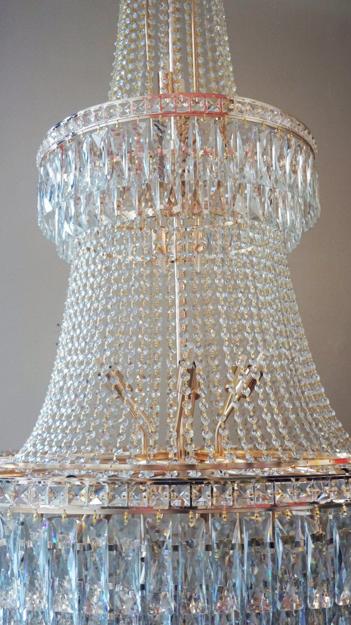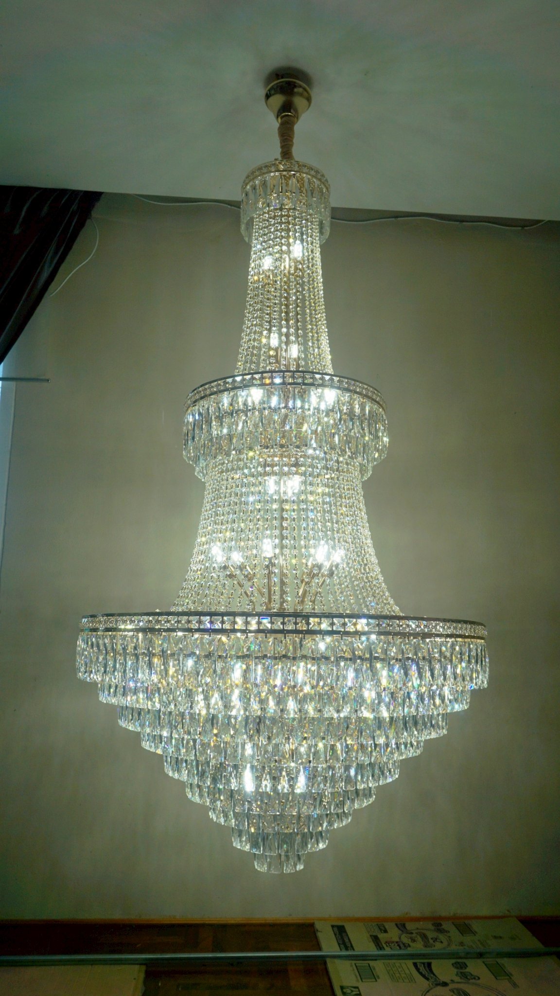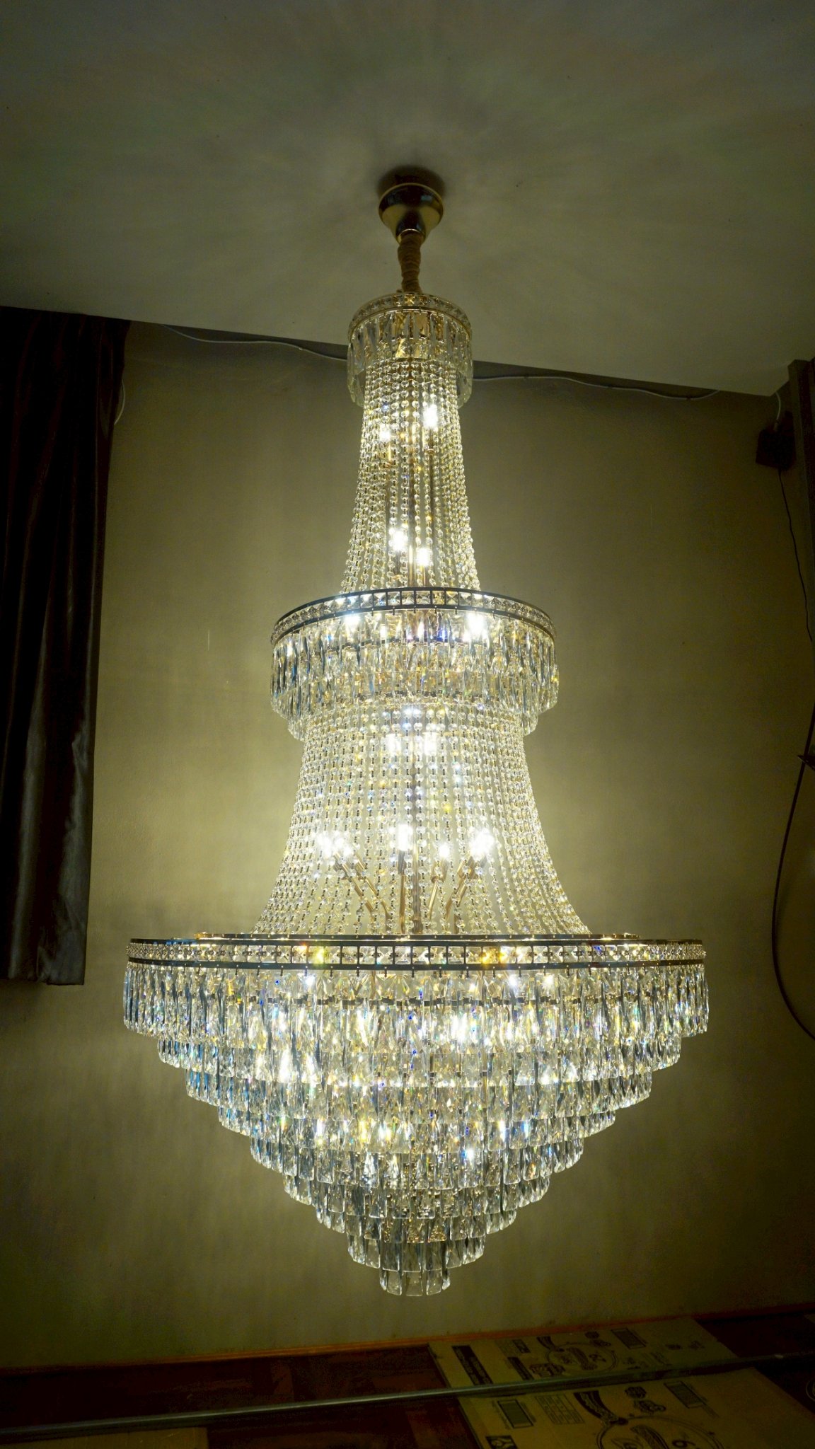 *โคมไฟระย้าคริสตัล สีทอง *ขนาดโคมไฟ กว้าง 100ซม. สูง 180ซม. น้ำหนักโคม 43 KG. *ชุดโซ่ยาว 100 ซม. *ขั้วไฟ E14*38 *ขนากบรรจุภัณฑ์ กล่องโคม (1/2) ก*ล*ส 101*101*25 CM นน.28 KG. กล่องเม็ด (2/2) ก*ล*ส 40*36*22 CM นน. 16 KG. *วัสดุ โครงเหล็กชุบสีทอง/เม็ดคริสตัล เหมาะสำหรับติดตั้งบน ห้องรับแขก ห้องโถง ที่ต้องการความ หรูหรา มีเอกลักษณ์ เหมาะกับโถงบันได ติดผ้าม่าน สีครีม สีแดง เข้ากันได้ดี กับโครงสีทอง